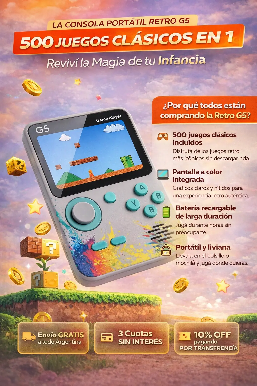 Una consola compacta con 500 juegos integrados, pantalla a color y batería recargable. El producto de "regalería tecnológica" con mayor rotación y atractivo visual de la temporada.